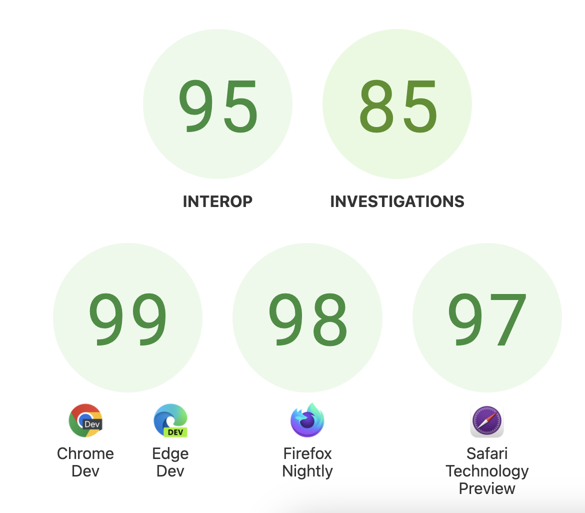 Regarding the :has() selector, a highly requested CSS feature, every implementation now passes 100% of the web-platform-tests designated for its focus area. Introducing a major new platform feature with such high interoperability highlights the Interop project’s effectiveness in advancing the platform while preserving implementation diversity, enhancing developer experience, and supporting user choice.