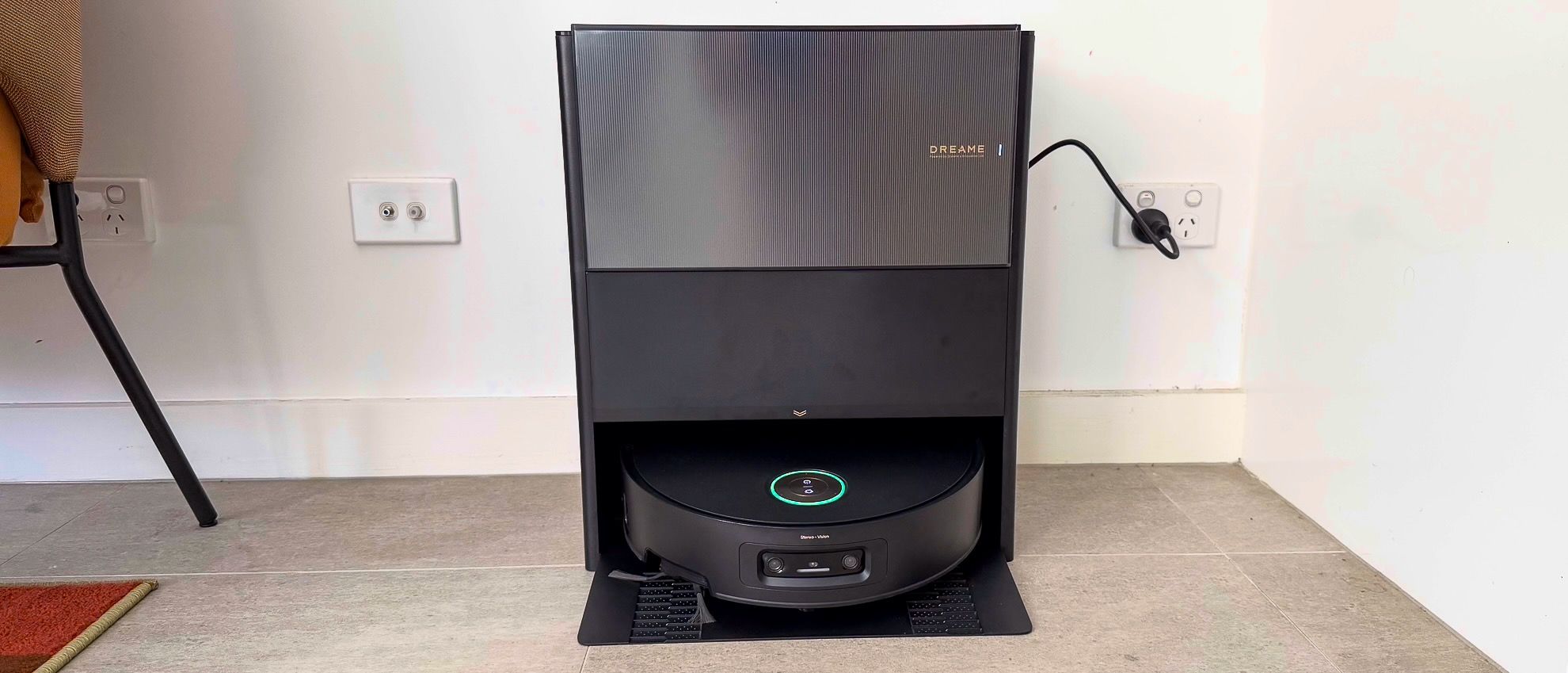 Upon unboxing, the Dreame Aqua10 Ultra’s dock presents a striking resemblance to a large Marshall speaker, characterized by its boxy shape and black finish. This aesthetic choice contributes to a classic, premium look, with clean lines and metallic accents. Even the green light around the robot’s main control button during charging adds to its sophisticated appearance.