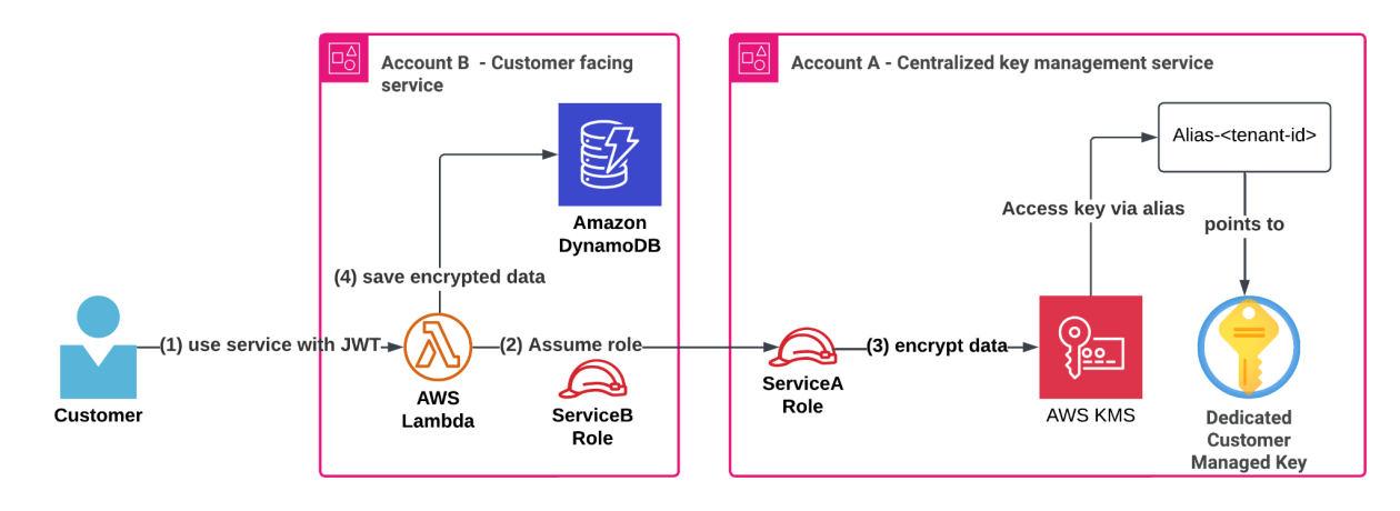 - ServiceBRole: A role in Account B that can assume ServiceARole in Account A to access the customer’s KMS key. This will be the AWS Lambda function’s execution role.