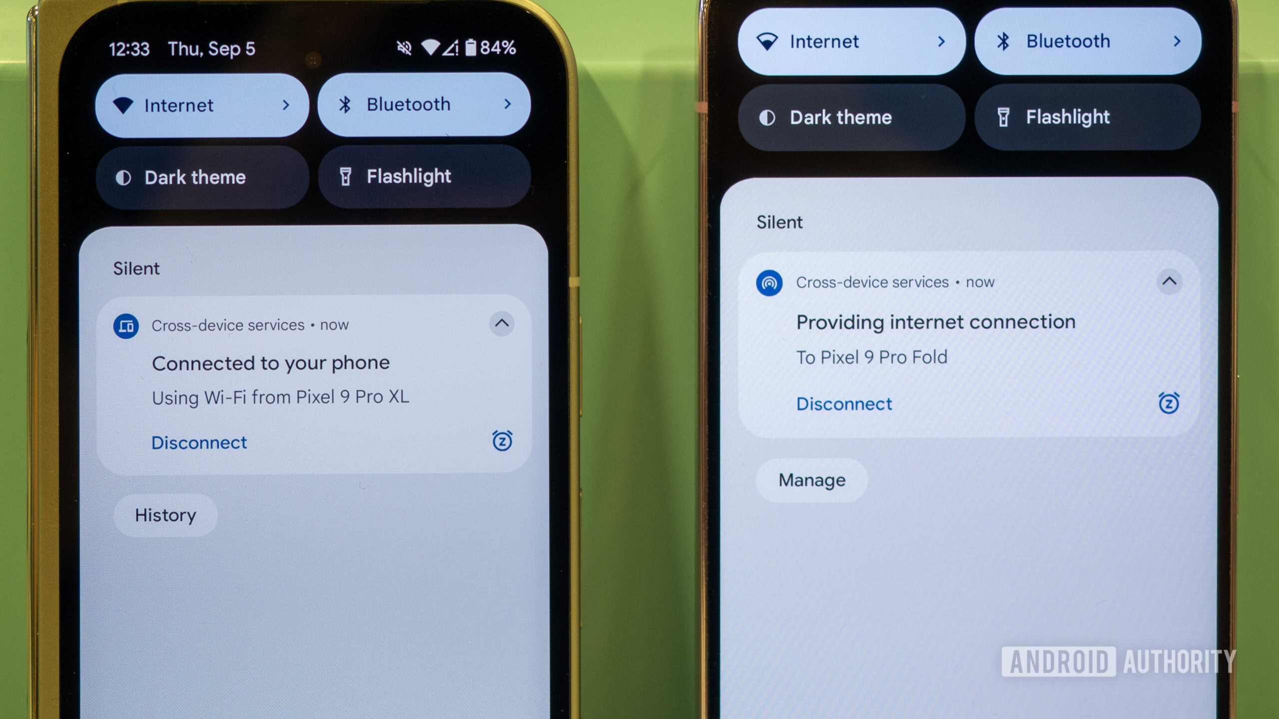 The cross-device functionalities offer significant convenience, particularly for users with multiple devices. For instance, when one device has a data connection (e.g., a Pixel 9 Pro XL with roaming) and another does not (e.g., a Pixel 9 Pro Fold), the instant hotspot feature allows the secondary device to access the internet without needing to manually activate or deactivate the hotspot on the primary device. This eliminates the need to touch or unlock the primary phone, streamlining the process of using a larger screen like a tablet while away from Wi-Fi and removing the inconvenience of manual hotspot management.